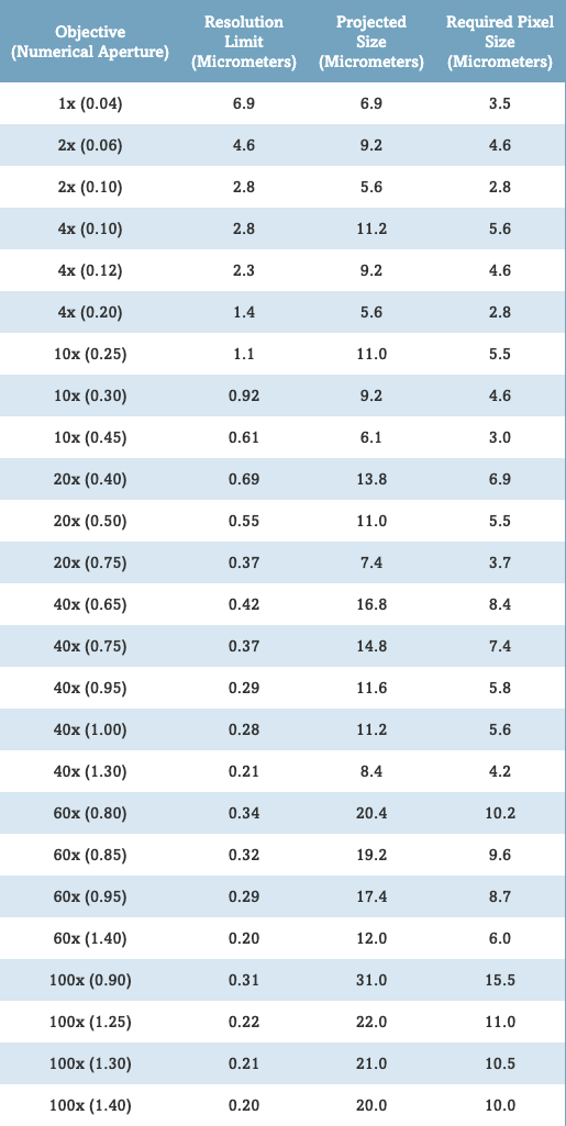 表一:匹配显微镜光学分辨率所需的像素尺寸