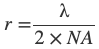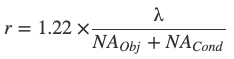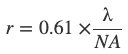 其中 r 是分辨率(两个样本点之间的最小可分辨距离),NA 等于物镜的数值孔径,λ 等于波长,NA(Obj)等于物镜的数值孔径,NA(Cond)是聚光镜的数值孔径。注意公式(1)和(2)的乘积因子不同,公式(1)为0.5,公式(2)则为0.61。这些方程式基于多种因素,包括光学物理学家为解决物镜和聚光镜的特性而进行的各种理论计算,不应视为任何一般物理定律的绝对值。假设当两个点光源中的其中一个所产生的Airy斑,与第二个Airy斑的衍射图像的一阶反射重叠时,这两个点光源可以被解析(分别成像)的条件被称为瑞利标准。在某些情况下,例如共聚焦、多光子荧光显微成像,分辨率实际上可能超过了这三个方程式中任何一个所设定的极限。其他因素(比如:较低的样本对比度,不正确的照明等)可能会降低分辨率,并且现实中 r 的最大值(使用中光谱波长550纳米时大约为0.20微米)和1.35~1.40的数值孔径往往很难实现。