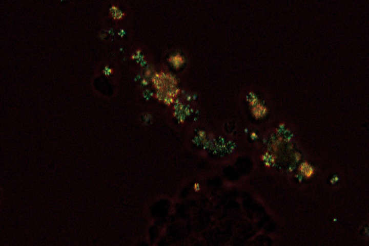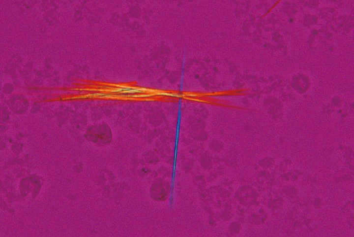 通过改变干涉色来识别尿酸晶体。这种技术非常适合痛风和伪痛风测试。