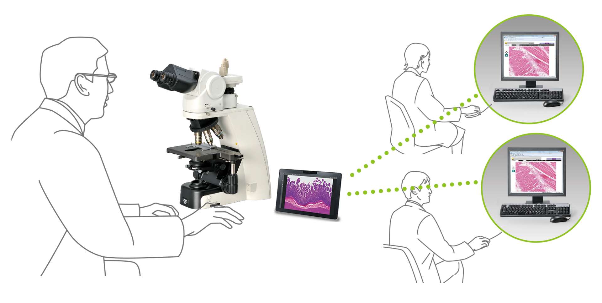 将Digital Sight 1000或DS-Fi3与安装了NIS-Elements L的平板电脑连接,就能通过网络与其他电脑共享被观察的标本图像。该软件还包含各种测量和注释功能。