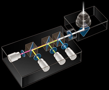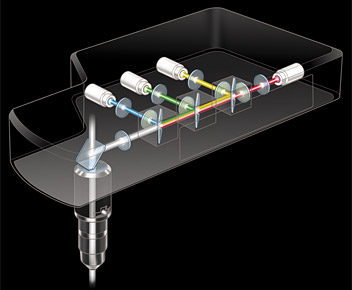 Three fluorescent probes are simultaneously excited and imaged–nucleus (blue), endothelium (green), and plasma (red). The long-wavelength ultrafast laser in combination with the ultrahigh-speed resonant scanner effectively reduces photodamage and makes time resolved multiphoton imaging of biomolecules possible.