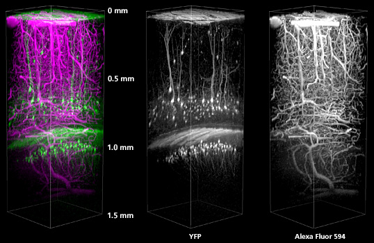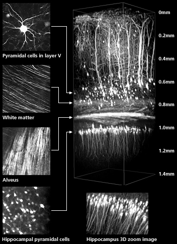 In vivo imaging of an anesthetized YFP-H mouse (4-week-old) via open skull method. Visualization of the entire layer V pyramidal neurons and the deeper hippocampal neurons. Deep imaging achieved for 3-dimensional imaging of hippocampal dendrites up to 1.4 mm into the brain.