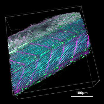 Lateral view of trunk of zebrafish transgenic line Tg[h2afv:GFP; EF1α: mCherry-CAAX] at 34 hpf. After breeding under the treatment of Phenyltiourea (PTU), which inhibits melanin synthesis, whole body was clarified with optical clearing solution LUCID-A. This transgenic line visualizes cell membrane and chromatin with mCherry (purple) and GFP (green), respectively. SHG (blue) indicates muscle fibers.