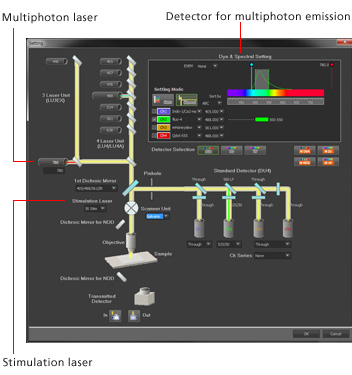 NDD尽可能靠近样本,以便检测来自深层活体标本内的最大散射信号。通过检测反射和透射的荧光信号,用于Ni-E/FN1立式显微镜的表观和双光子GaAsP NDD的组合可以获得明亮和高信噪比的图像。
