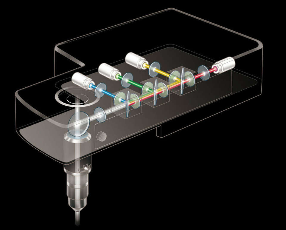 AX R MP的非退扫探测器(NDD)在各配置中皆贴近物镜后焦平面,可最大程度地收集荧光信号。根据观察的荧光波长,在标准配置中可灵活选择2至4个多碱PMT或GaAsP PMT。
