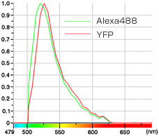 Left: Spectral image, Right: Unmixed image (green: Alexa Fluor® 488, red: YFP)