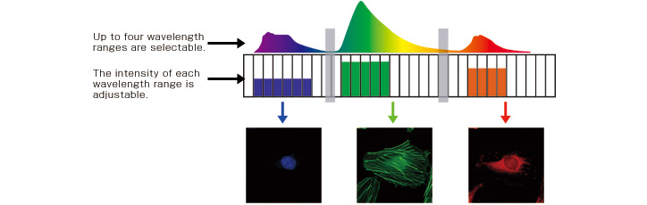 通过从使用的荧光探针的光谱匹配的32个通道中选择所需的光谱范围,并组合它们来执行滤波功能,可以实现无滤光强度调节。