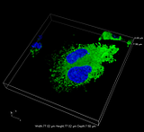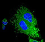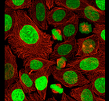 Actin of HeLa cell expressing H2B-YFP was stained with Phalloidin-Alexa Fluor® 488.