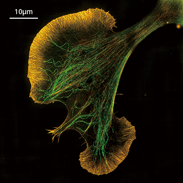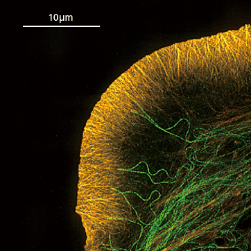 Growth cone of NG108 cell labelled with TRITC-phalloidin (F-actin, orange) and Alexa Fluor® 488 (microtubules, green)