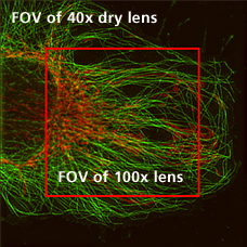 干镜头现在与N-SIM以及共焦显微镜兼容,因此无需切换镜头就可以使用共聚焦成像和超分辨率成像。 低倍率和宽视场干透镜可以在样品组织的周围进行高分辨率观察。