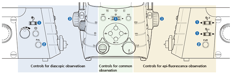 所有按钮和切换的布局均以其控制的照明类型为基础。用于控制透射观察的按钮位于显微镜的左侧,而用于控制落射荧光观察的按钮位于右侧。用于控制常规操作的按钮在前面板上。这种分区方式便于记忆, 在暗室内操作显微镜时尤其实用。