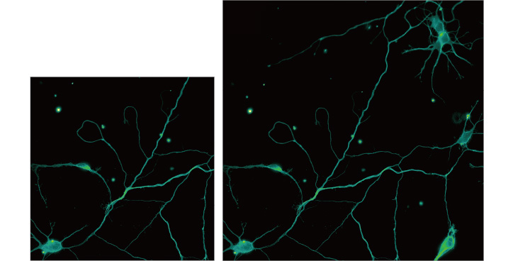 Neuron culture stained for microtubules (Alexa Fluor® 488), captured with CFI Plan Apochromat Lambda 60XC objective and DS-Qi2 camera. Conventional FOV (left) and new Ti2 FOV (right).