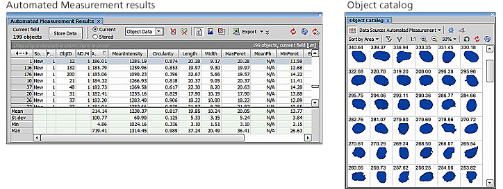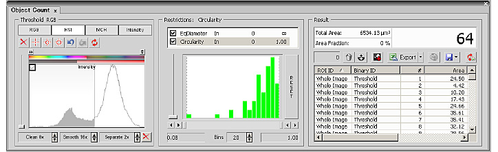 自动测量通过使用RGB/HIS或强度值的阈值处理,通过创建二进制层来测量从图像中提取的对象的数量或面积。结果可以列出或导出为文本或Excel文件。可以保存和重用阈值参数。