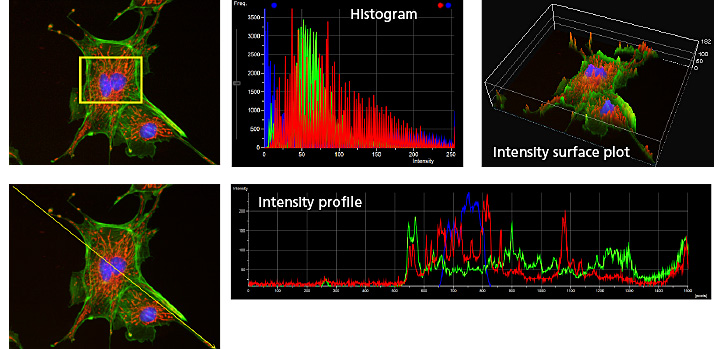 直方图测量测量整个图像或定义区域上像素的强度分布。强度线分布测量显示在一条线上的强度分布。强度曲线图显示具有z轴线高度的图像的强度分布。