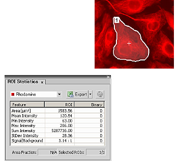 用户定义的ROI(感兴趣区域)可以进行像面积,最大或最小强度等常用像素测量。ROI或单个图像的多ROI统计结果或多维数据集的统计结果可显示并轻松导出为文本或Excel文件。