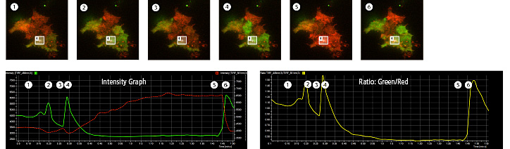 时间测量创建了延时成像或捕获的延时图像中顺序强度变化的曲线图。比率视图功能*允许测量两个波长在多个ROI之间的比率,并显示比例逐个像素。数字数据和图形图像是可导出的,图形上的测量也可以使用。 (*只有AR)
