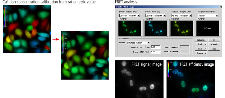 例如,使用易于配置的向导可获得比例荧光染料Fura2的Ca2+离子浓度校准。使用三种滤波器组(三种激发荧光组合:“供体 – 受者”,“受体 – 受体”和“供体 – 受体”)和两种渗透因子也可获得更正的FRET图像和FRET比率。