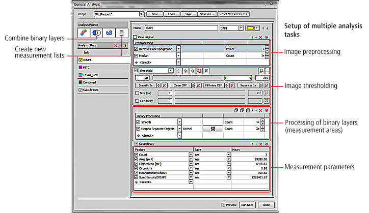 通用分析模块简化了图像分析组合功能的设置,如图像预处理和阈值处理,二值图像和特征的处理以及测量设置。