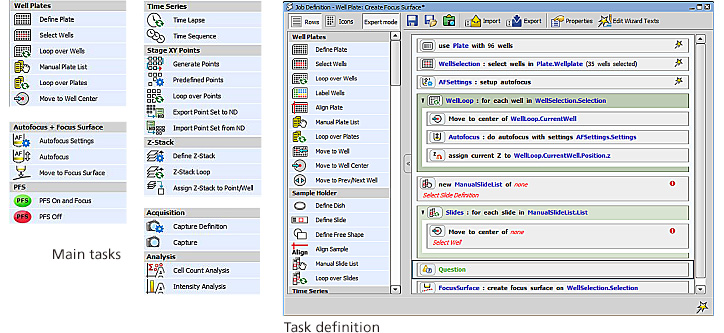HC模板提供了高通量成像/分析的简化操作。然而,JOBS编辑器可以轻松创建更复杂和自定义的实验模板,从图像采集到分析,通过提供许多可用的任务,而不需要高级的数据编程知识和创建宏的需要。