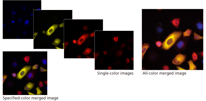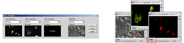 可以将多个单通道图像(例如,三通道采集图像中的两个)合并在一起,以创建全深度单独可缩放图像的叠加。 使用AR和BR,可以通过将一个图像的标签拖动到另一个图像上来合并图像。 使用D,通过选择红色,蓝色,绿色和明场通道的每个图像进行合并。