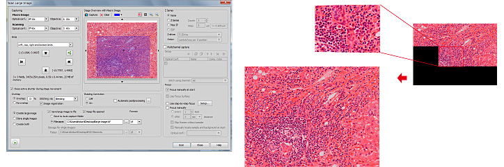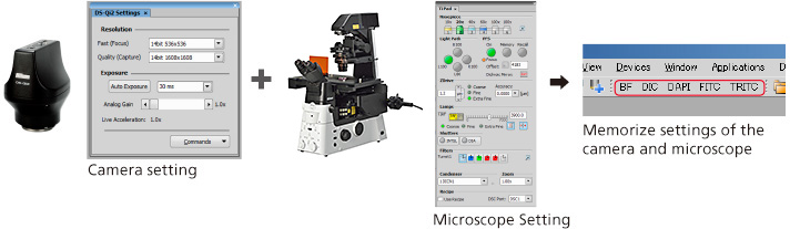 当NIS-Elements与Ni-E显微镜和DS-L4配合使用时,可以使用Ni-E上的图像捕获按钮轻松指定图像采集区域,同时通过Ni-E的目镜或DS-L4的屏幕来观察低倍率图像。