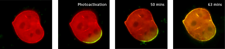 A mouse embryonic fibroblast co-expressing mCherry-tagged lamin A (red) and photo-activatable GFP-tagged lamin A was photo-converted (green) in the lower right region using the DMD module and 405 nm LED light. Time-lapse images were captured using the epi-fluorescence illuminator. By photoactivating a sub-population of the lamin proteins, one can observe their dynamics and subunit-exchange behavior.