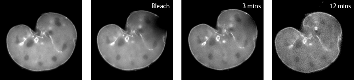 A mouse embryonic fibroblast expressing mCherry-lamin A was spot-photobleached in the upper right corner of the nucleus using the FRAP module to study the dynamics of lamin A molecules. Time-lapse images were acquired using the epi-fluorescence illuminator.